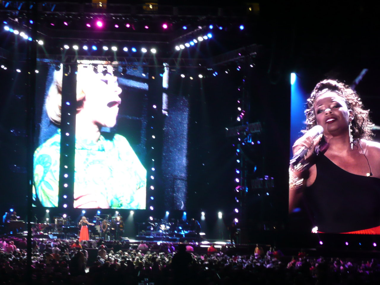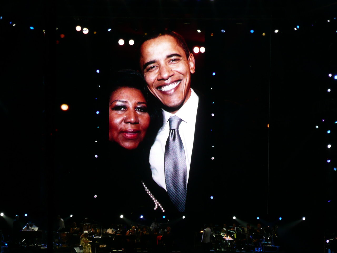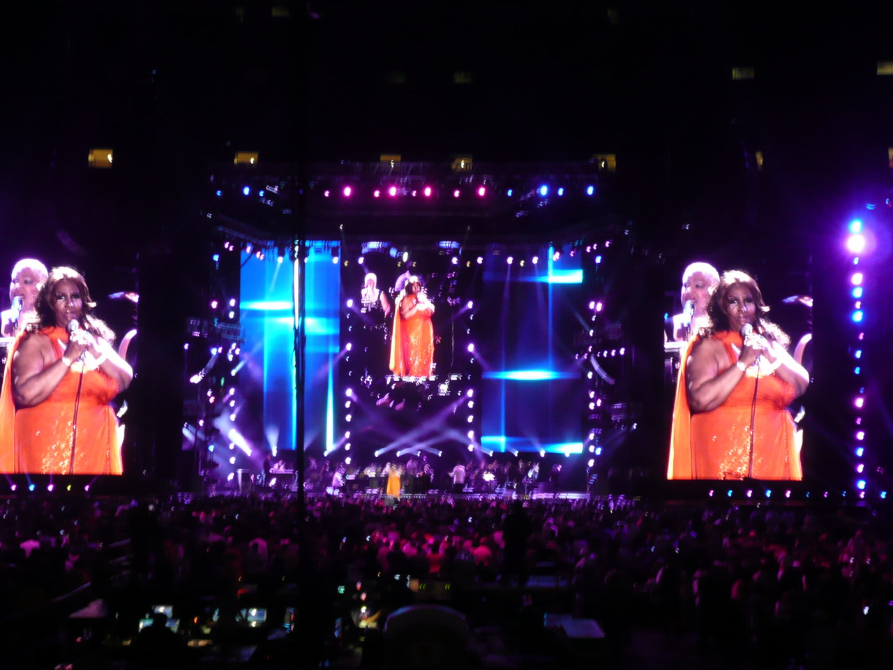 林「そうなんですよね。さすがにアレサはパスできない(笑)。で、当初は何故かPM9:47という、中途半端というか妙に細かい時間設定で始まる予定だったアレサ。2005年以来7年ぶりの登場です。一時は健康状態も心配されたアレサですが、タンジェリン・カラーのドレスに身を包み、オーケストラを従えて歌う女王様は、そんなこともあったのかと思わせるほどで。前半は“(You Make Me Feel Like)A Natural Woman”“Think”“I Never Loved A Man(The Way I Love You)”といったアトランティック時代の代表曲を中心に、さすがの貫録を見せつけてくれました」